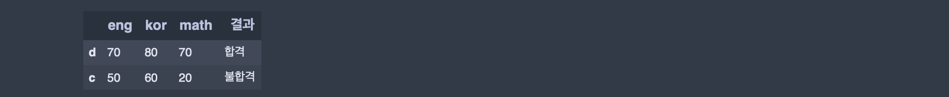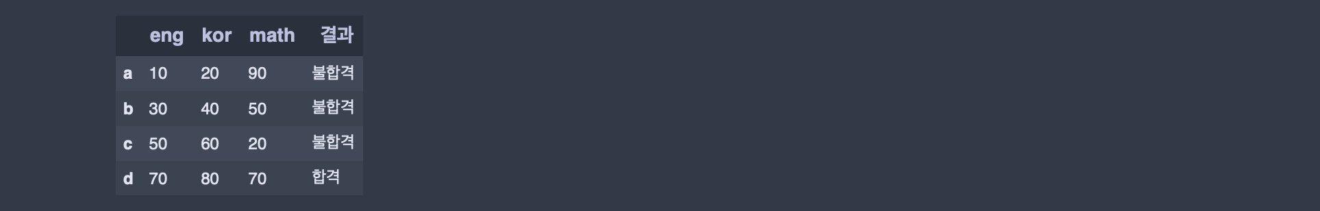 df['결과'] =df.apply(lambda v:'합격' if v.mean()>=70 else '불합격',axis=1)