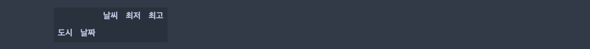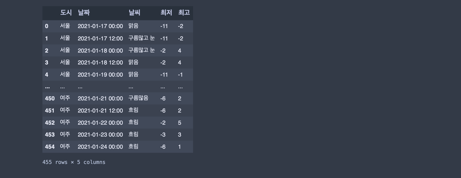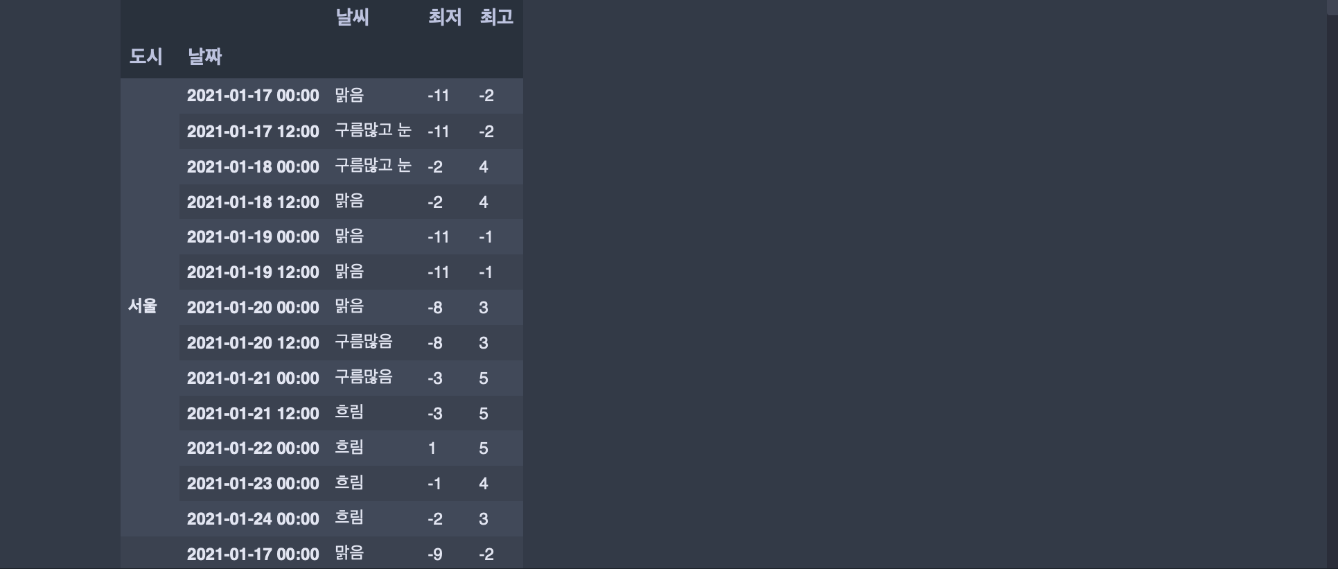 [{'도시': '서울', '날짜': '2021-01-17 00:00', '날씨': '맑음', '최저': -11, '최고': -2},