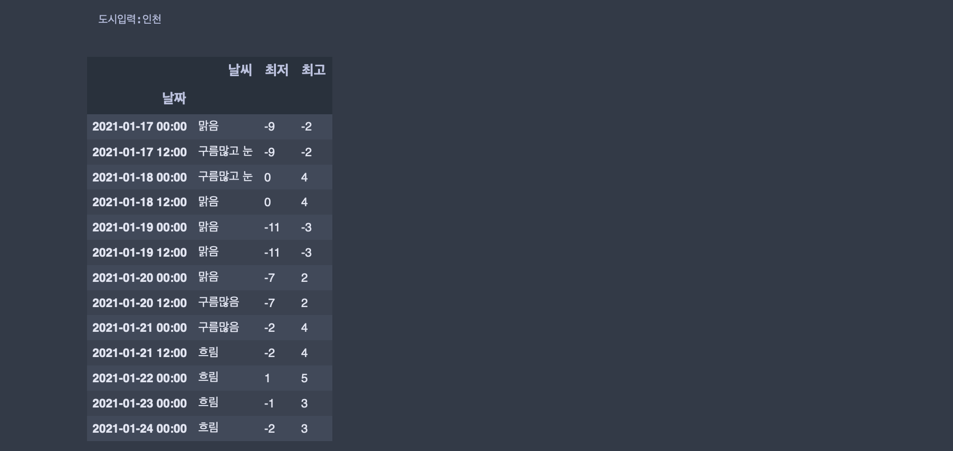 {'도시': '인천', '날짜': '2021-01-17 00:00', '날씨': '맑음', '최저': -9, '최고': -2},