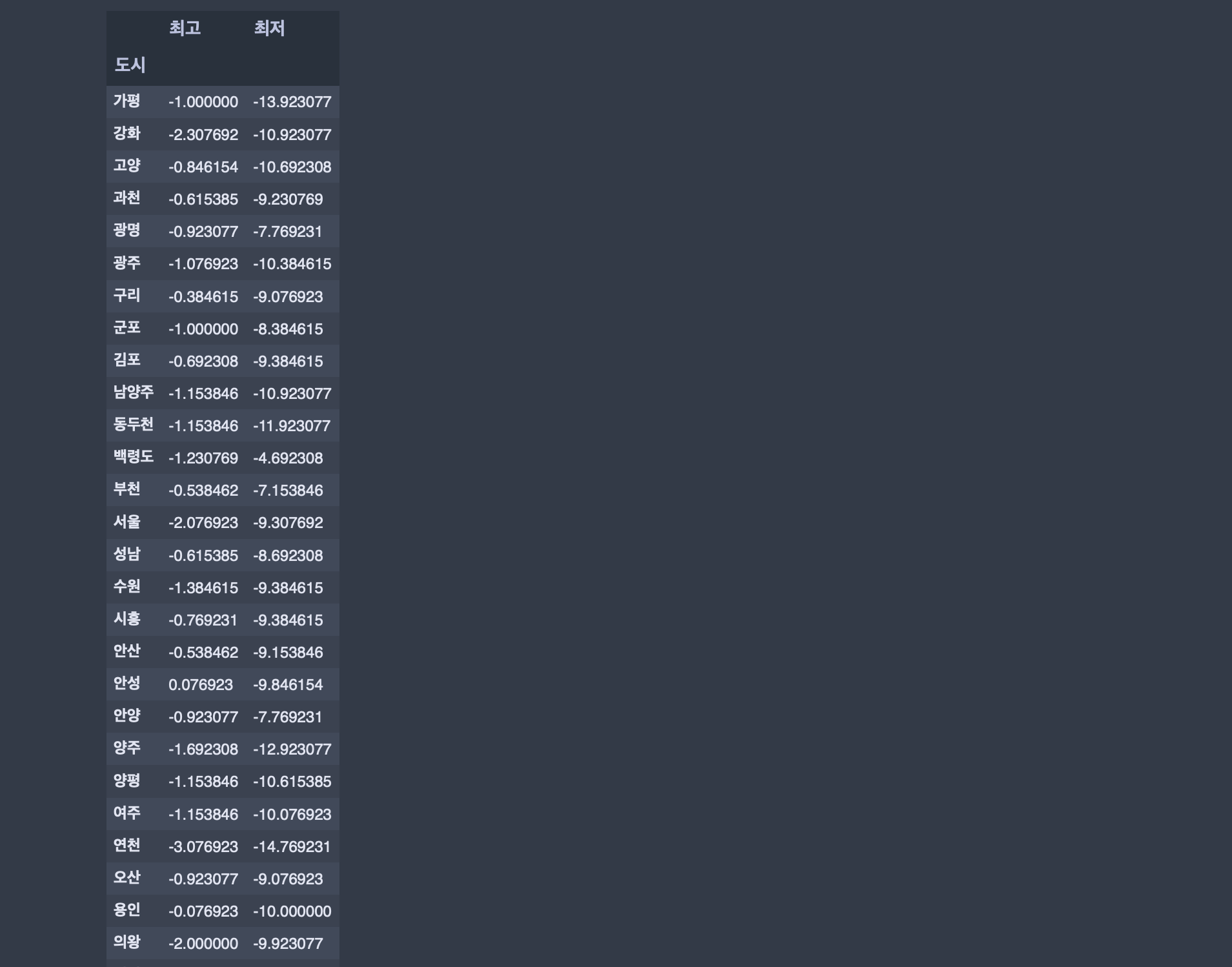 #2. 도시별 최고, 최저기온 평균을 구하시오