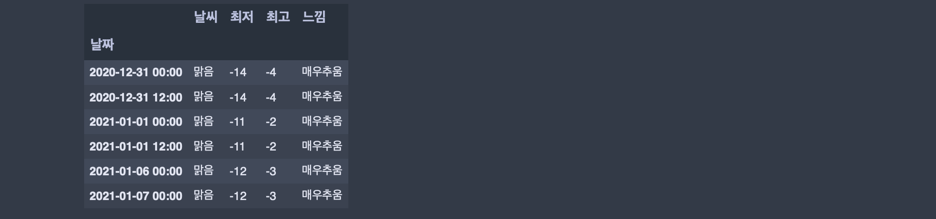 {'도시': '서울', '날짜': '2021-01-24 00:00', '날씨': '흐림', '최저': -2, '최고': 3},