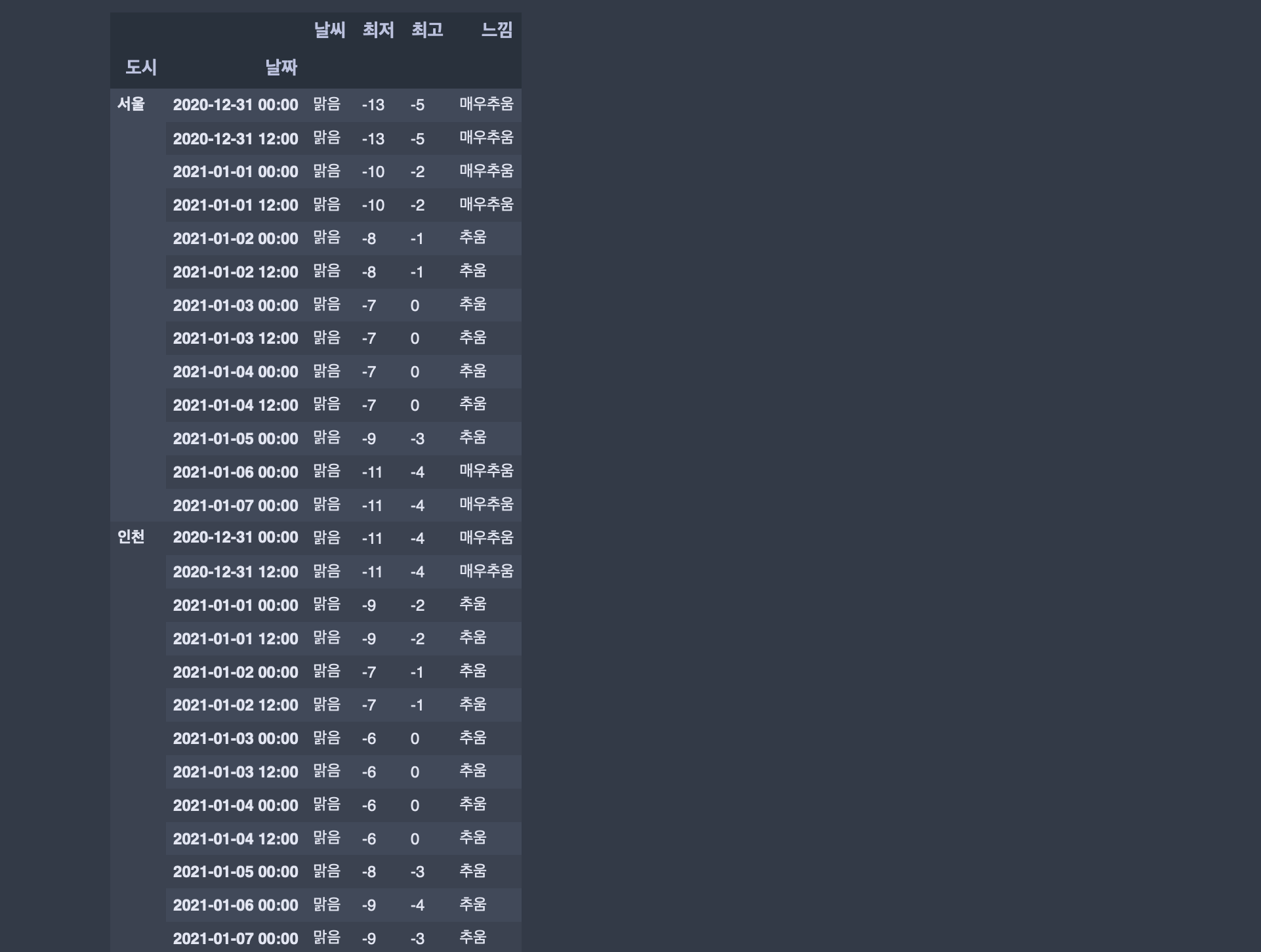{'도시': '인천', '날짜': '2021-01-21 12:00', '날씨': '흐림', '최저': -2, '최고': 4}