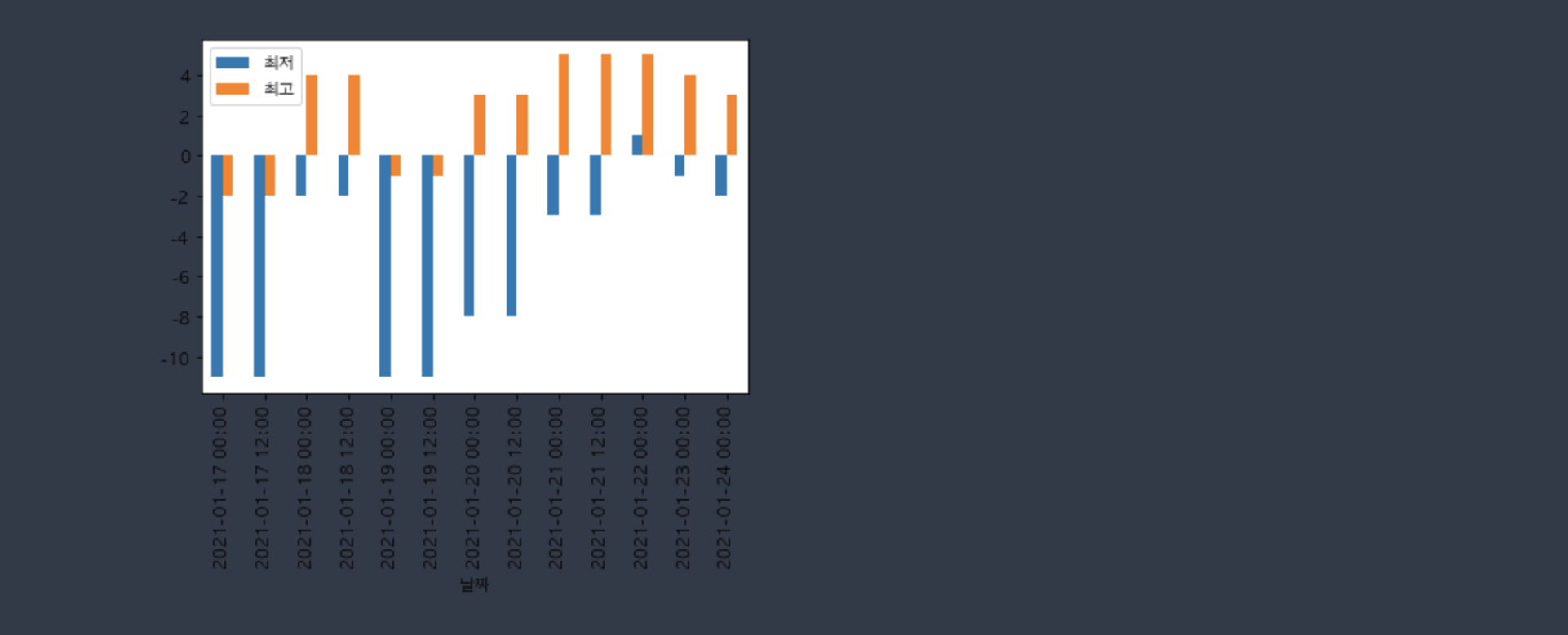 #7. 서울지역의 날짜별 최고 최저기온을 바차트로 그리시오