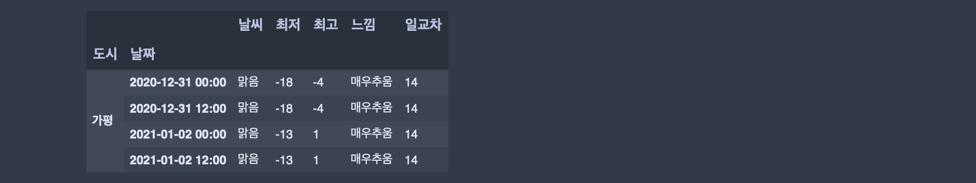 kdf.set_index(['도시','날짜'] ,inplace=True)