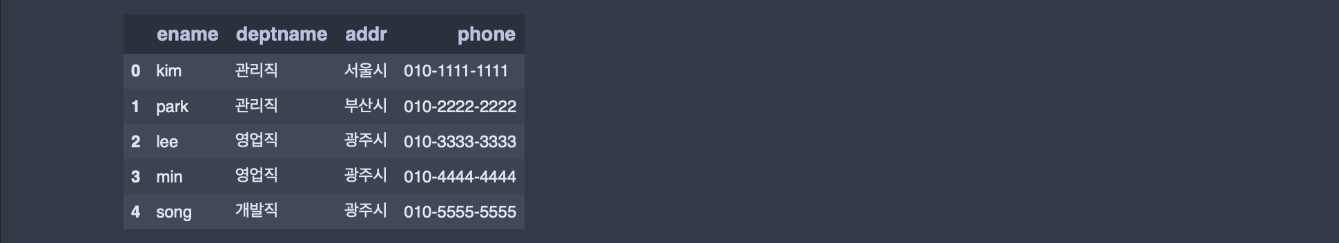 {'empno':4, 'addr':'광주시','phone':'010-5555-5555'}