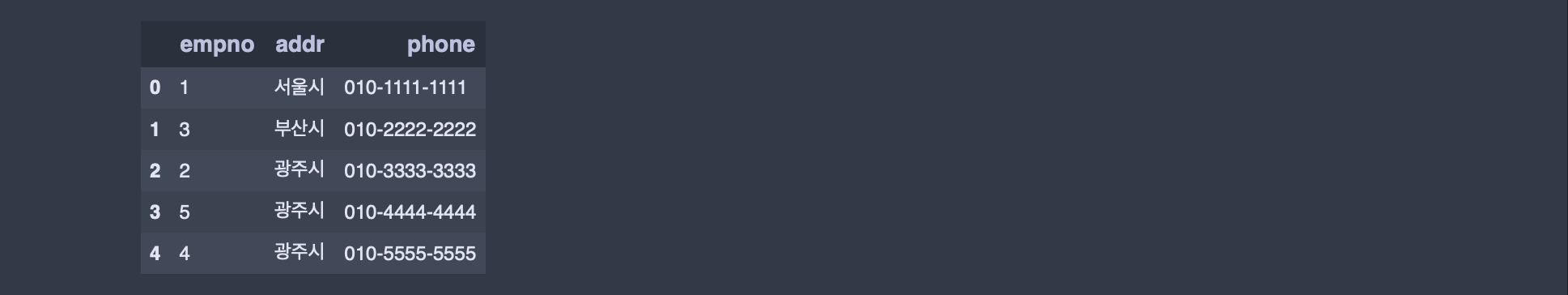 {'empno':2, 'addr':'광주시','phone':'010-3333-3333'},