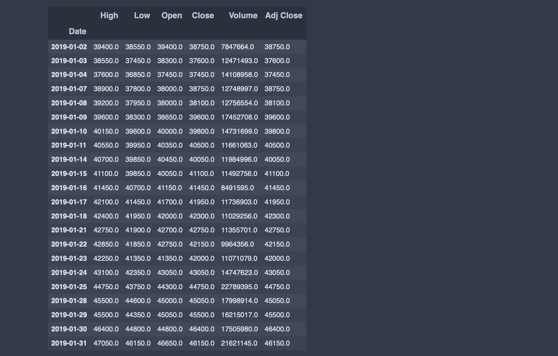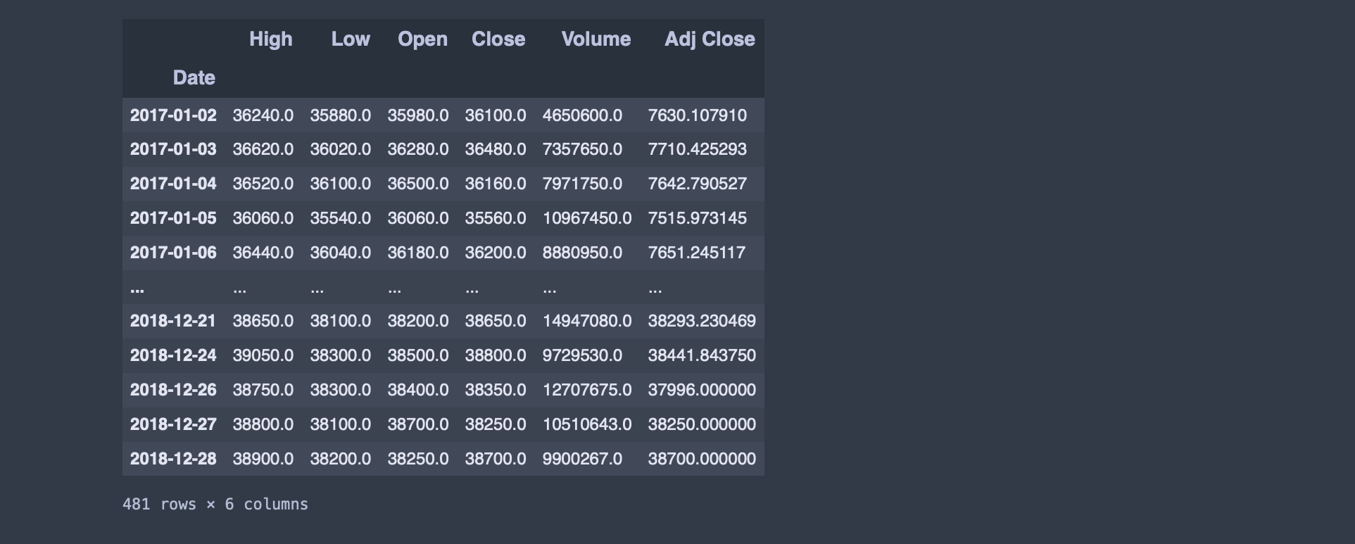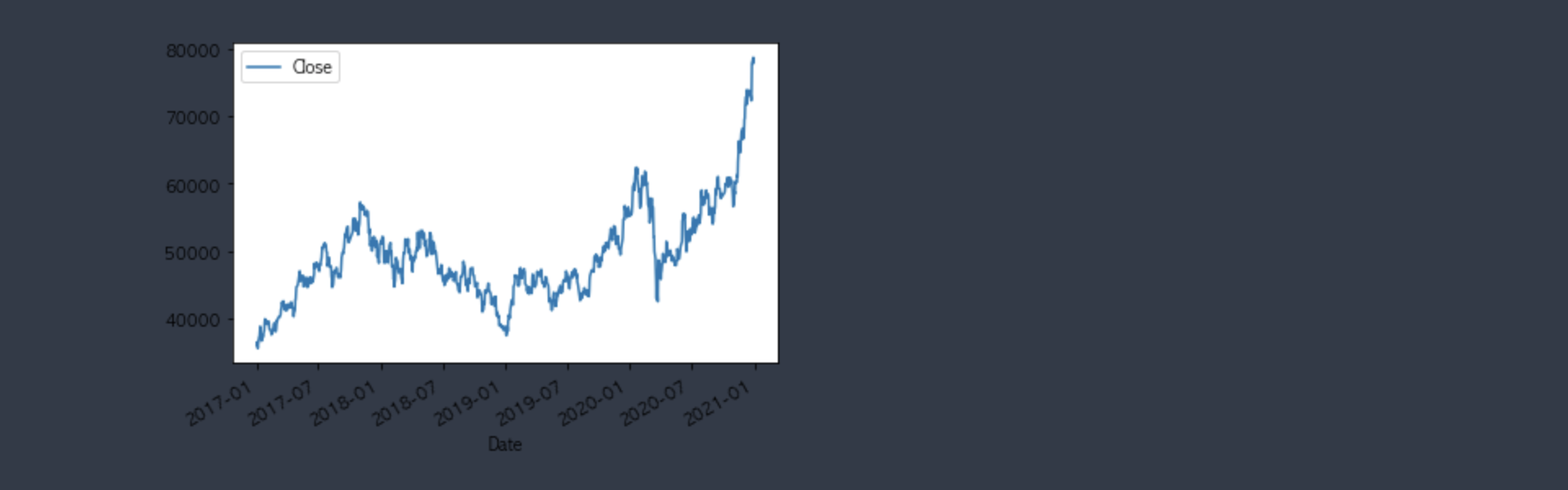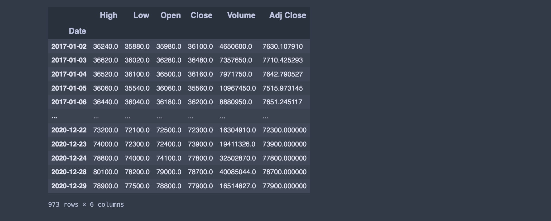 samsungDF = data.get_data_yahoo('005930.KS', '2017-01-01') # KS->코스피, 끝날짜 생략하면 오늘날짜까지