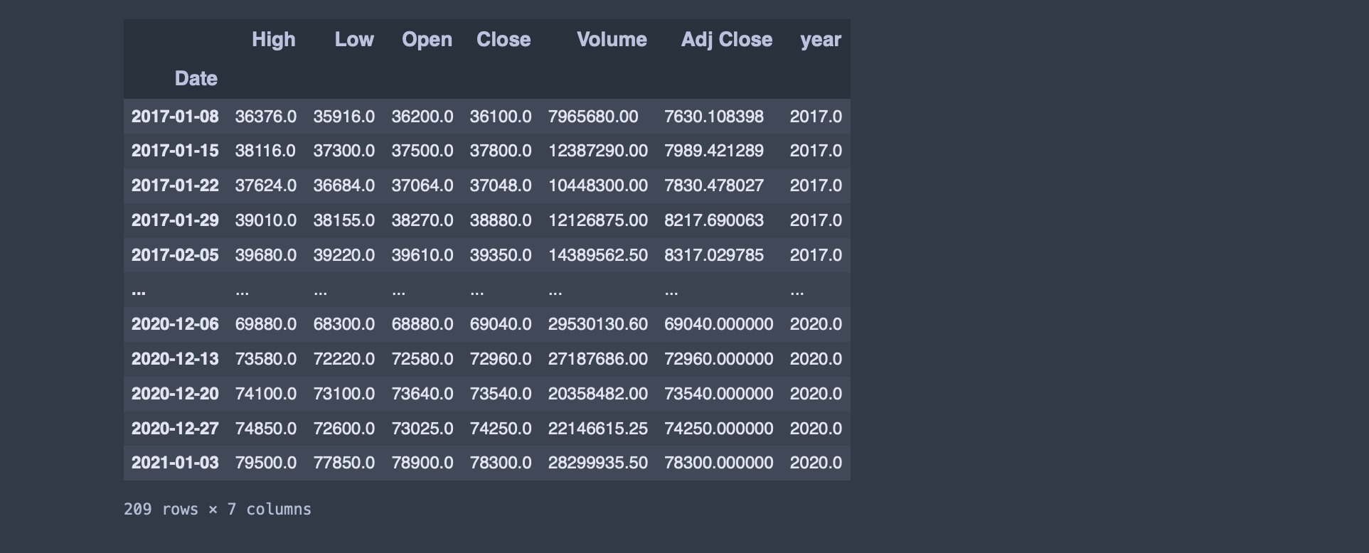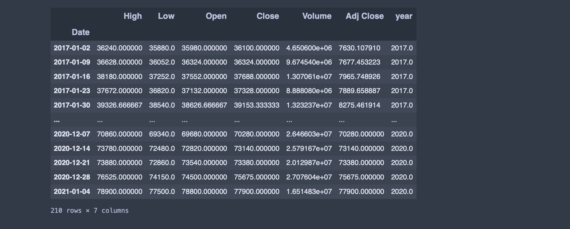 samsungDF.resample('w').mean() # 각 주간별 평균값 w->weekly