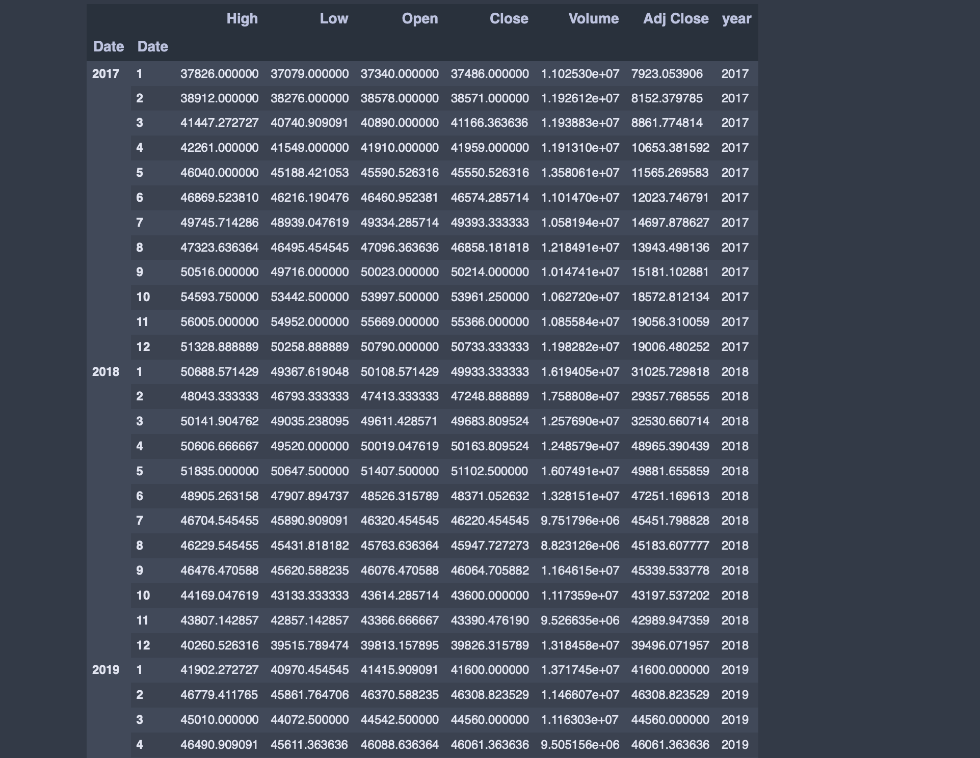 samsungDF.groupby([samsungDF.index.year,samsungDF.index.month]).mean()