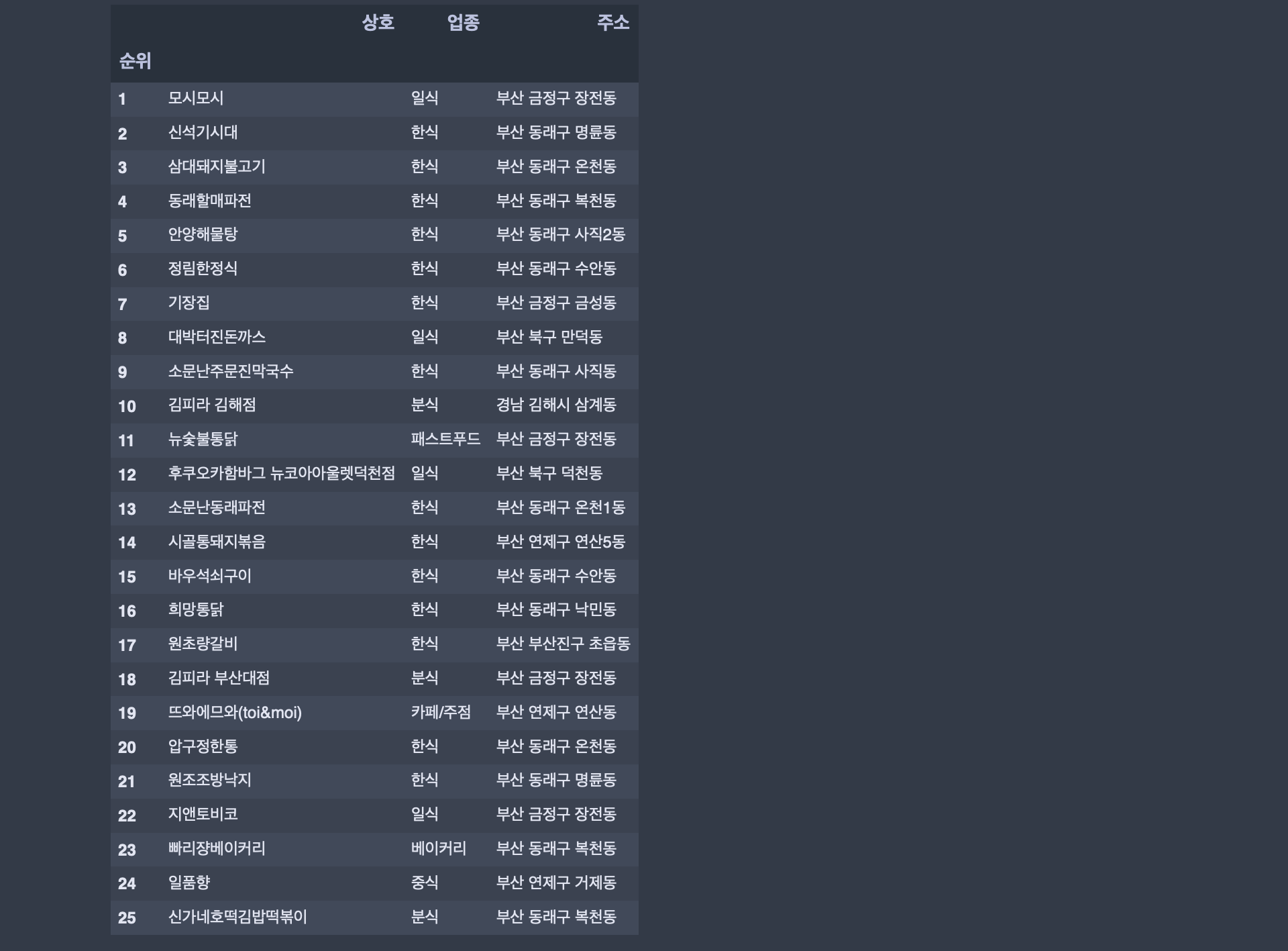 {'순위': '25', '상호': '신가네호떡김밥떡볶이', '업종': '분식', '주소': '부산 동래구 복천동'}]