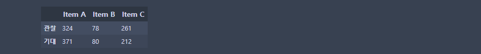 이 자료로 다음과 같이 관찰 빈도와 기대 빈도를 만들 수 있다.