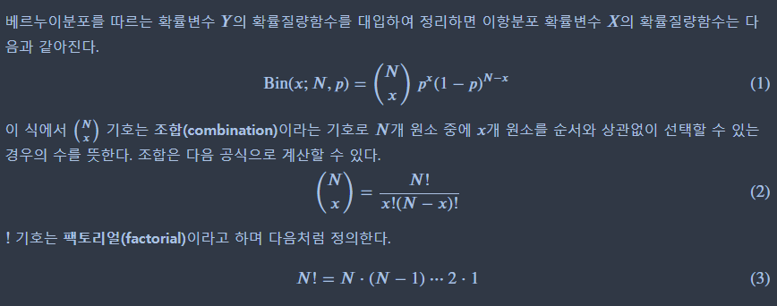 이항 분포는 이산 확률분포에서 가장 많이 사용하는 분포로, 이전 글에서 알아보았던 베르누이 분포의 업그레이드 버전이다. 먼저 베르누이 분포가 “성공”과 “실패” 이렇게 2가지의 상황만 나오는 실험에서 사용한다고 했었는데, (참고) 이항 분포도 마찬가지다. 그래서 베르누이 분포와 똑같이 성공확률은 p이고, 실패 확률은 1-p이다.