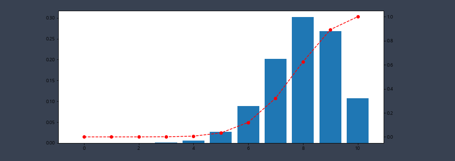 2. 한 축구 선수가 페널티킥을 차면 5번 중 4번은 성공한다고 한다. 그럼 이 선수가 10번의 페널티킥을 차서 7번 성공할 확률을 구하고 확률 질량 함수와 누적 분포 함수를 시각화하여 나타내시오