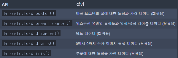 - target: 분류용은 레이블 값, 회귀용은 숫자 결과값 데이터