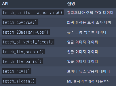 - 온라인 데이터 세트 (데이터 크기가 커서 온라인에서 데이터를 다운로드 한 후에 불러오는 예제 데이터 세트)