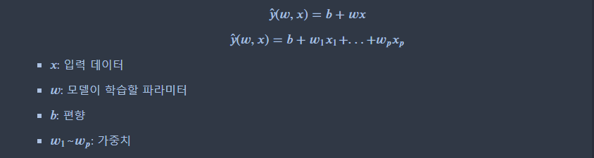 - 회귀 분석을 위한 선형 모델은 다음과 같이 정의