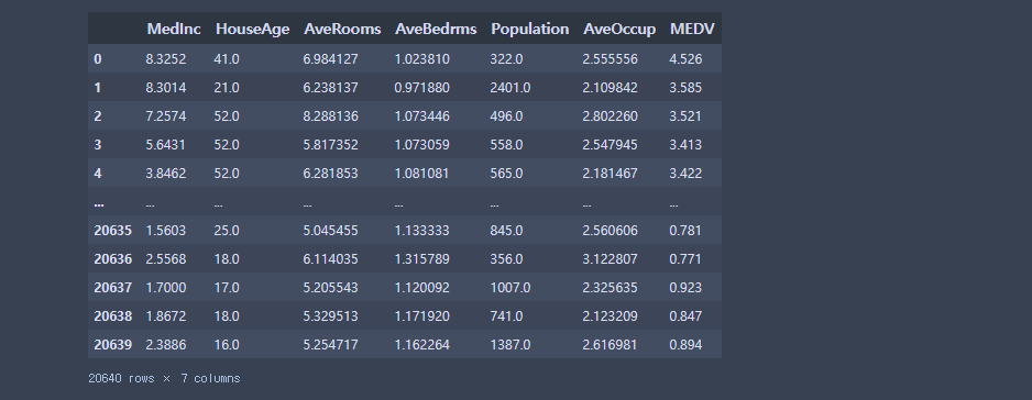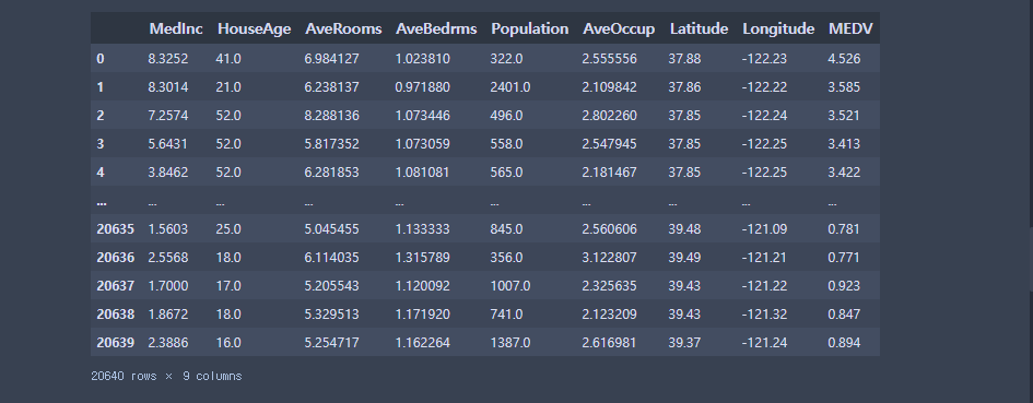 'target': array([4.526, 3.585, 3.521, ..., 0.923, 0.847, 0.894]),