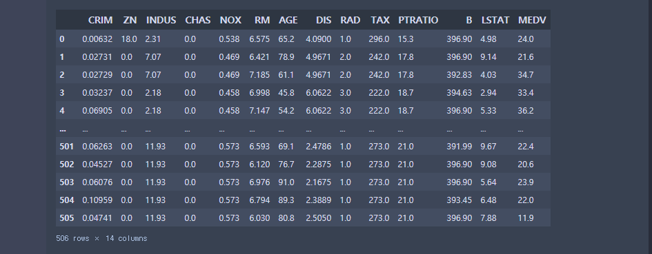 boston_df['MEDV'] = boston.target # MEDV : 주택 중위 가격