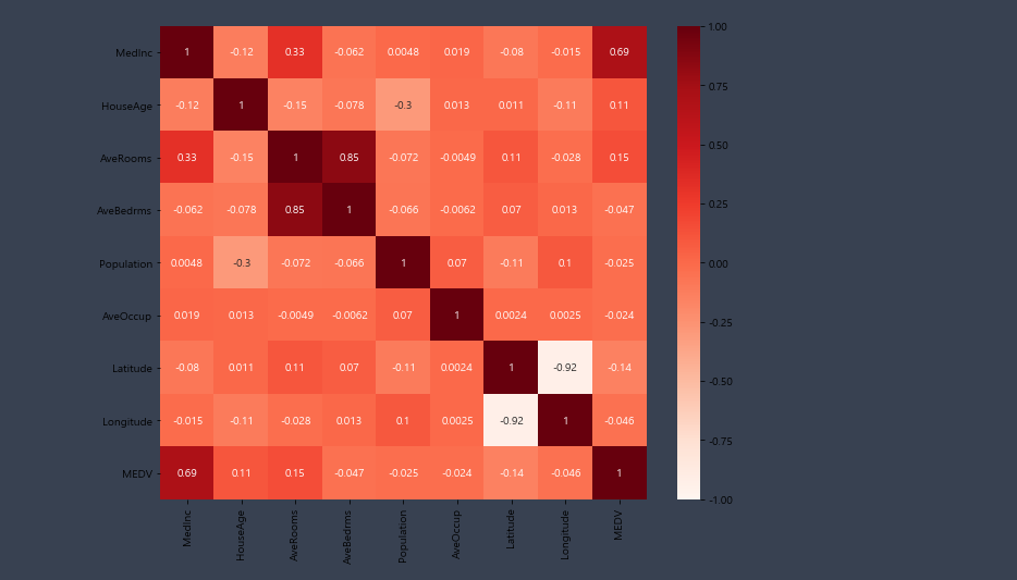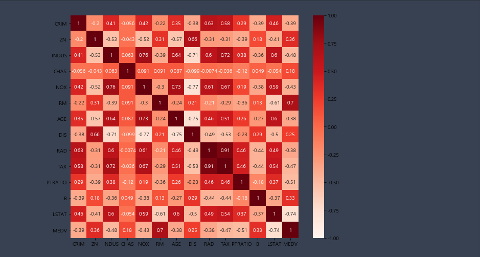 annot=True, cmap='Reds', vmin=-1,vmax=1) # annot : 주석