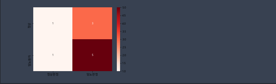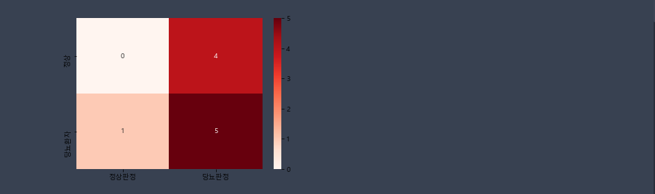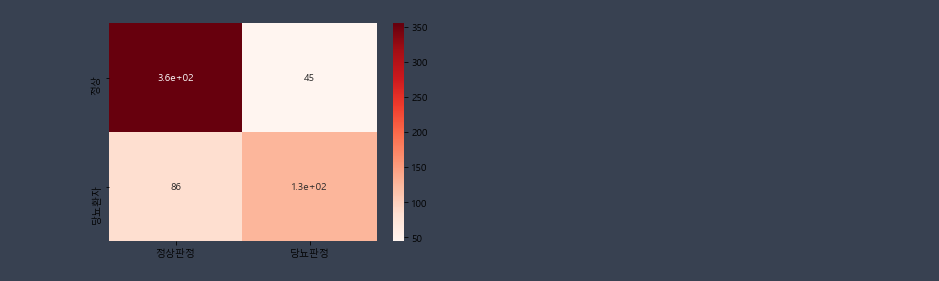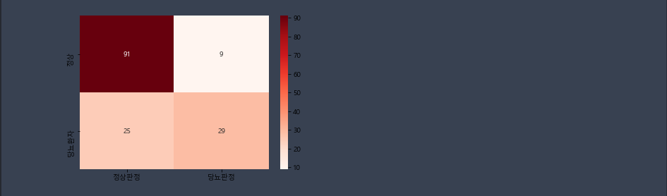 sns.heatmap(cm,annot=True,cmap='Reds',xticklabels=['정상판정','당뇨판정'],yticklabels=['정상','당뇨환자'] )