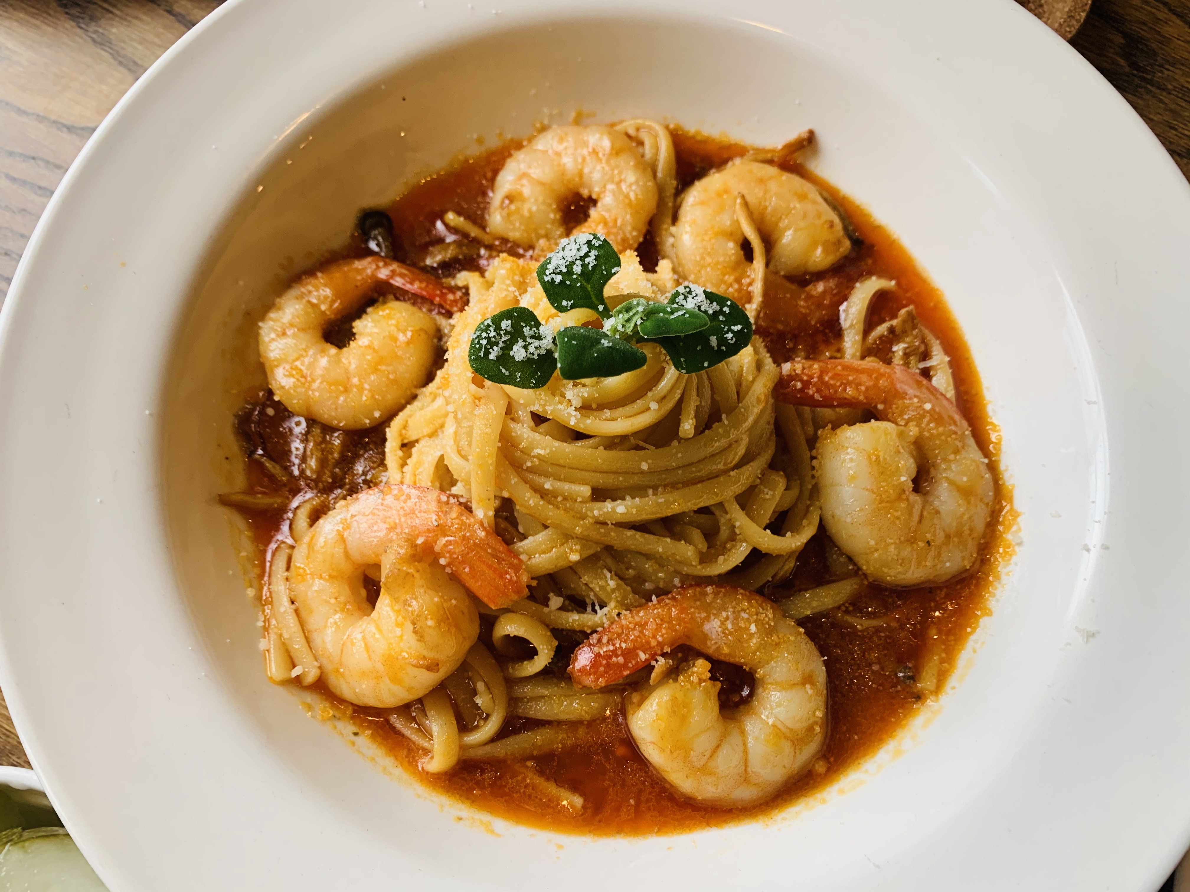 이름 그대로 약간 매콤한 오일 파스타 + 새우 6마리