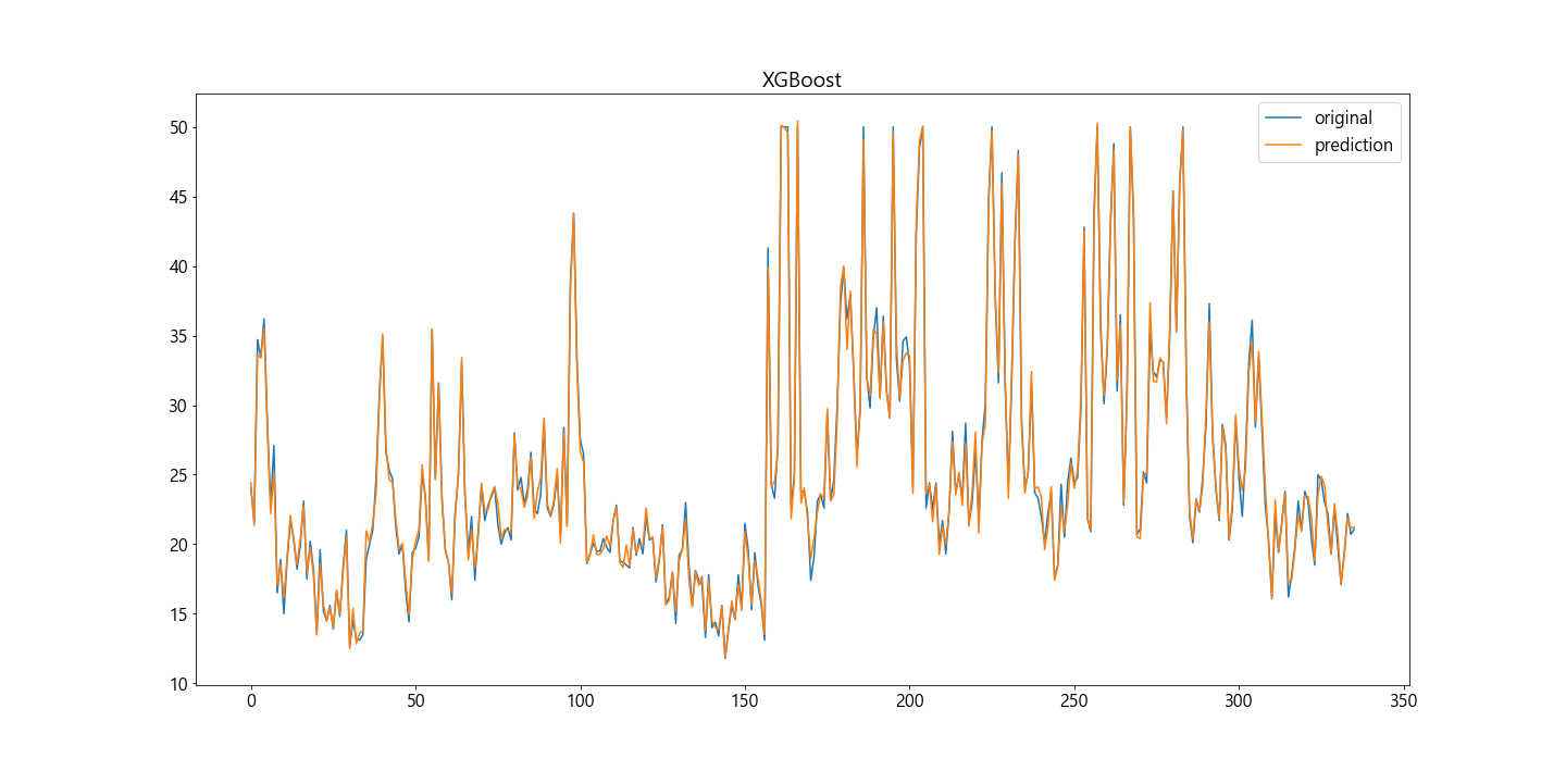 #XGBoost plt.plot(y, label='original') plt.plot(pred10, label='prediction') plt.title('XGBoost') plt.legend() plt.show()