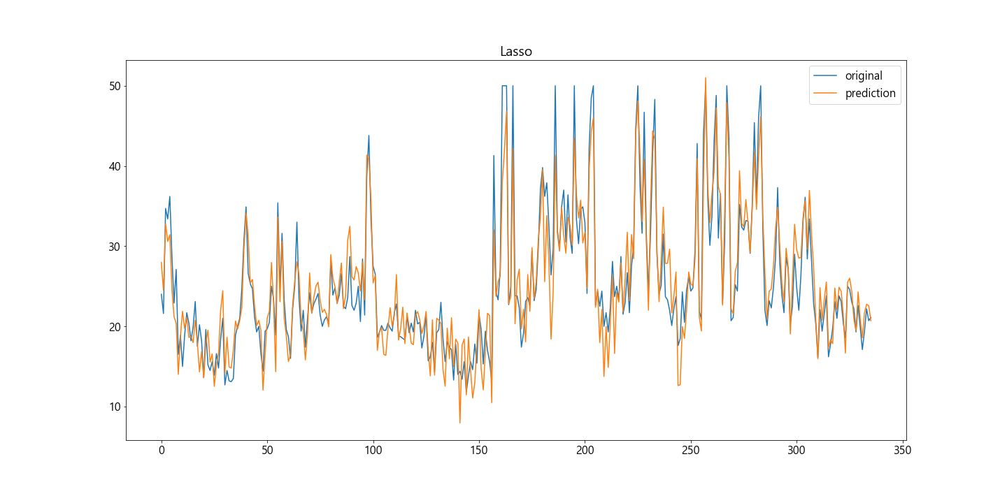 #Lasso plt.plot(y, label='original') plt.plot(pred4, label='prediction') plt.title('Lasso') plt.legend() plt.show()