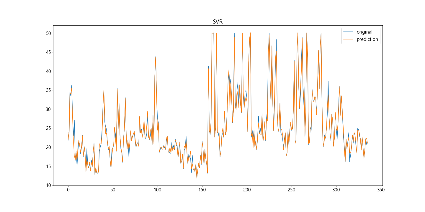 #SVR plt.plot(y, label='original') plt.plot(pred6, label='prediction') plt.title('SVR') plt.legend() plt.show()