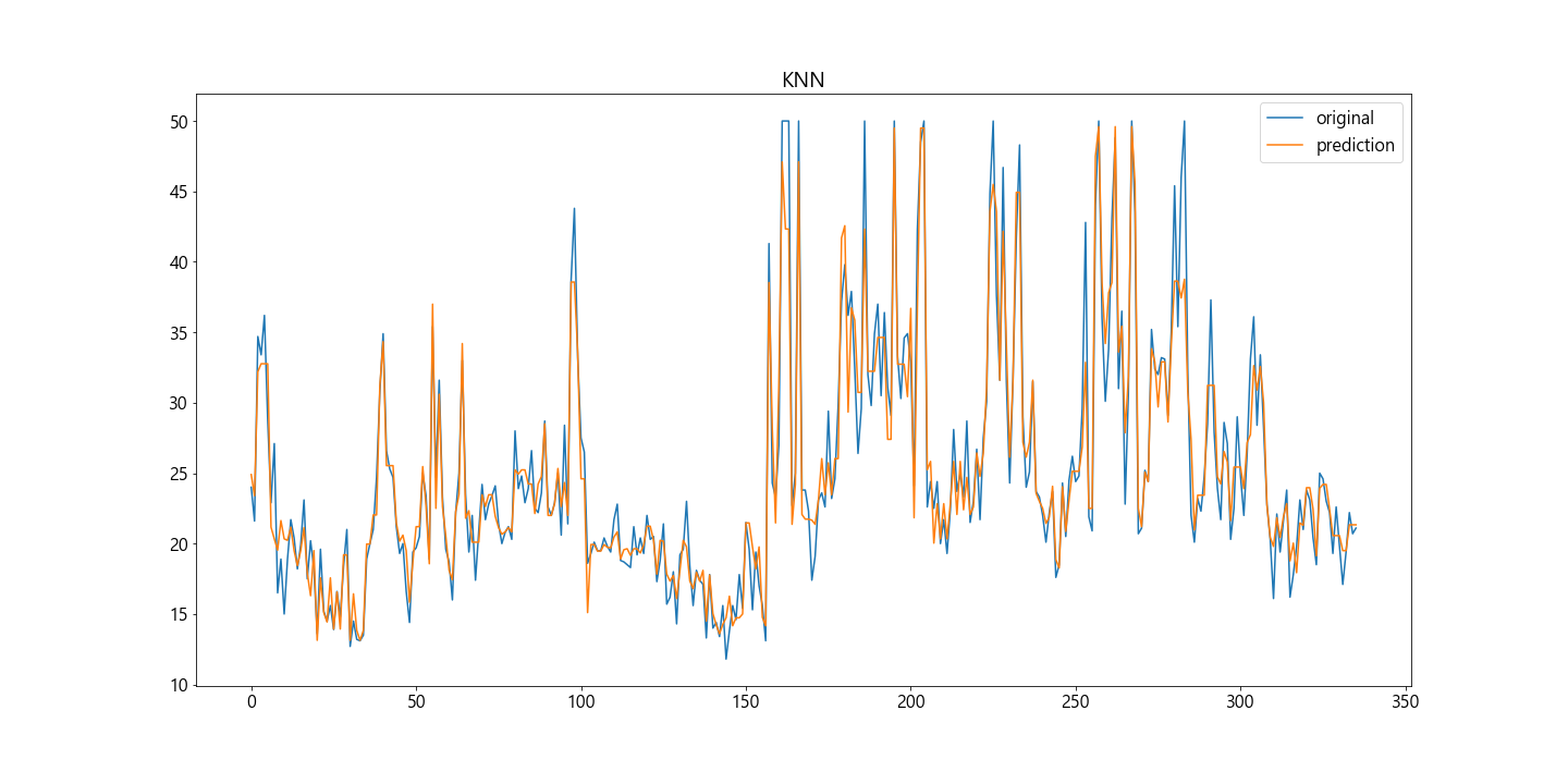 #KNN plt.plot(y, label='original') plt.plot(pred1, label='prediction') plt.title('KNN') plt.legend() plt.show()