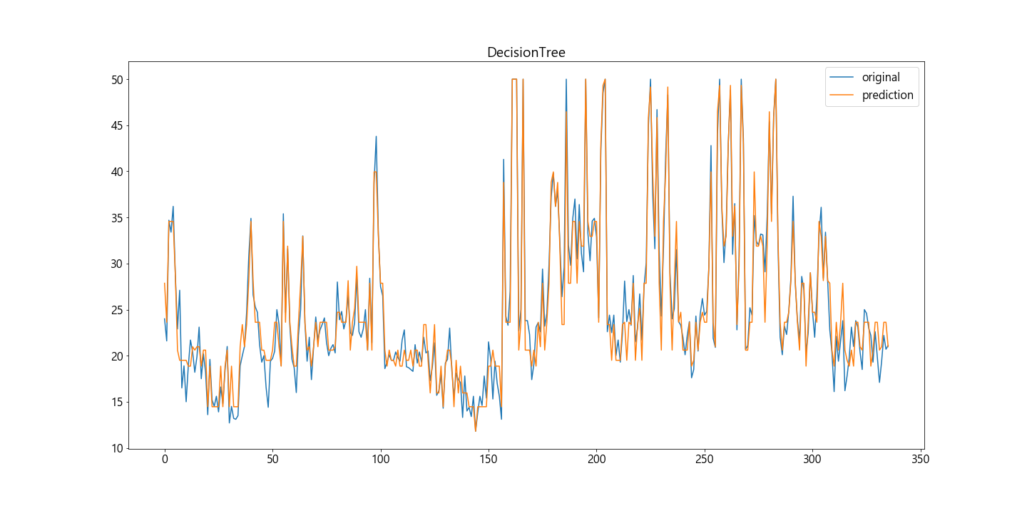#DecistionTreeRegressor plt.plot(y, label='original') plt.plot(pred7, label='prediction') plt.title('DecisionTree') plt.legend() plt.show()