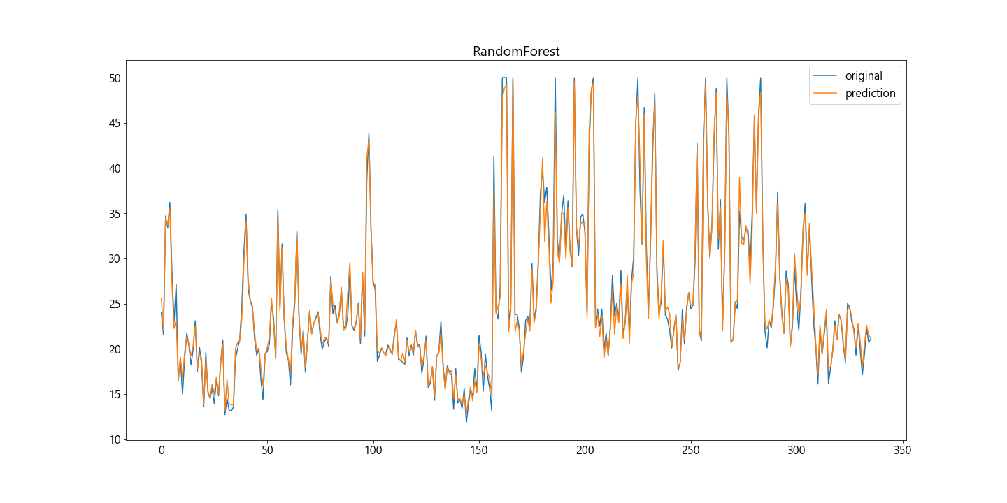 #RandomForest plt.plot(y, label='original') plt.plot(pred8, label='prediction') plt.title('RandomForest') plt.legend() plt.show()