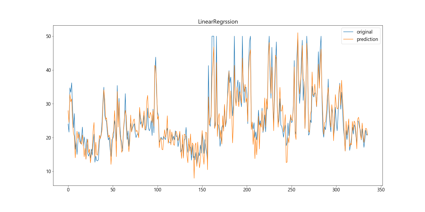 #LinearRegrssion plt.plot(y, label='original') plt.plot(pred2, label='prediction') plt.title('LinearRegrssion') plt.legend() plt.show()
