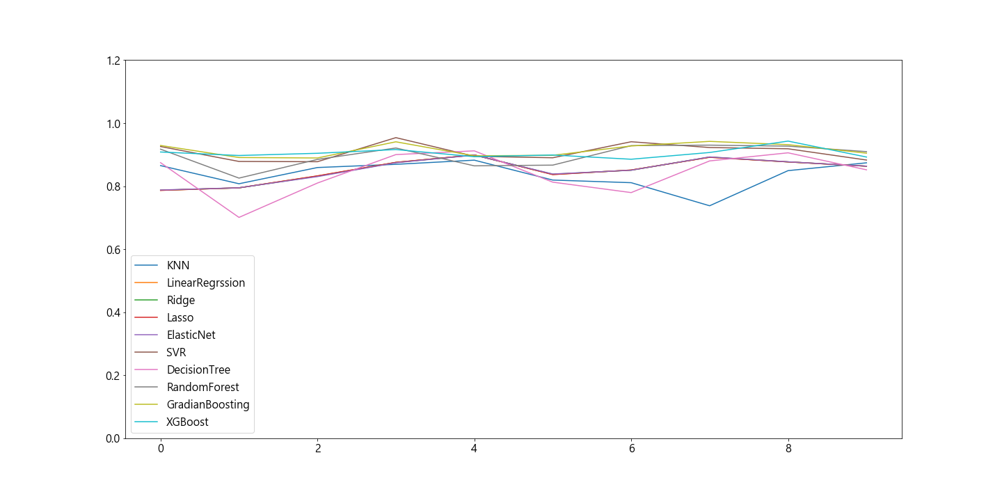 plt.plot(r1, label='KNN') plt.plot(r2, label='LinearRegrssion') plt.plot(r3, label='Ridge') plt.plot(r4, label='Lasso') plt.plot(r5, label='ElasticNet') plt.plot(r6, label='SVR') plt.plot(r7, label='DecisionTree') plt.plot(r8, label='RandomForest') plt.plot(r9, label='GradianBoosting') plt.plot(r10, label='XGBoost') plt.legend() plt.ylim(0, 1.2) plt.show()