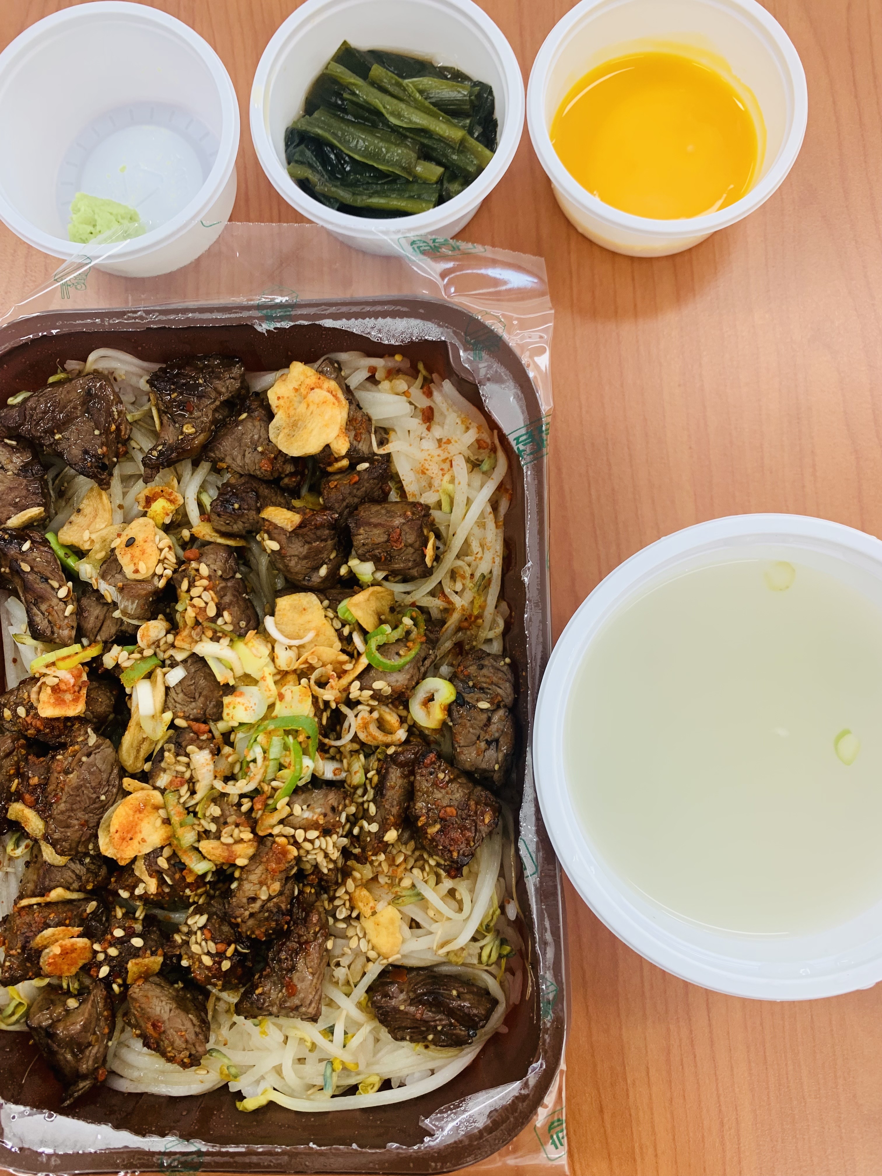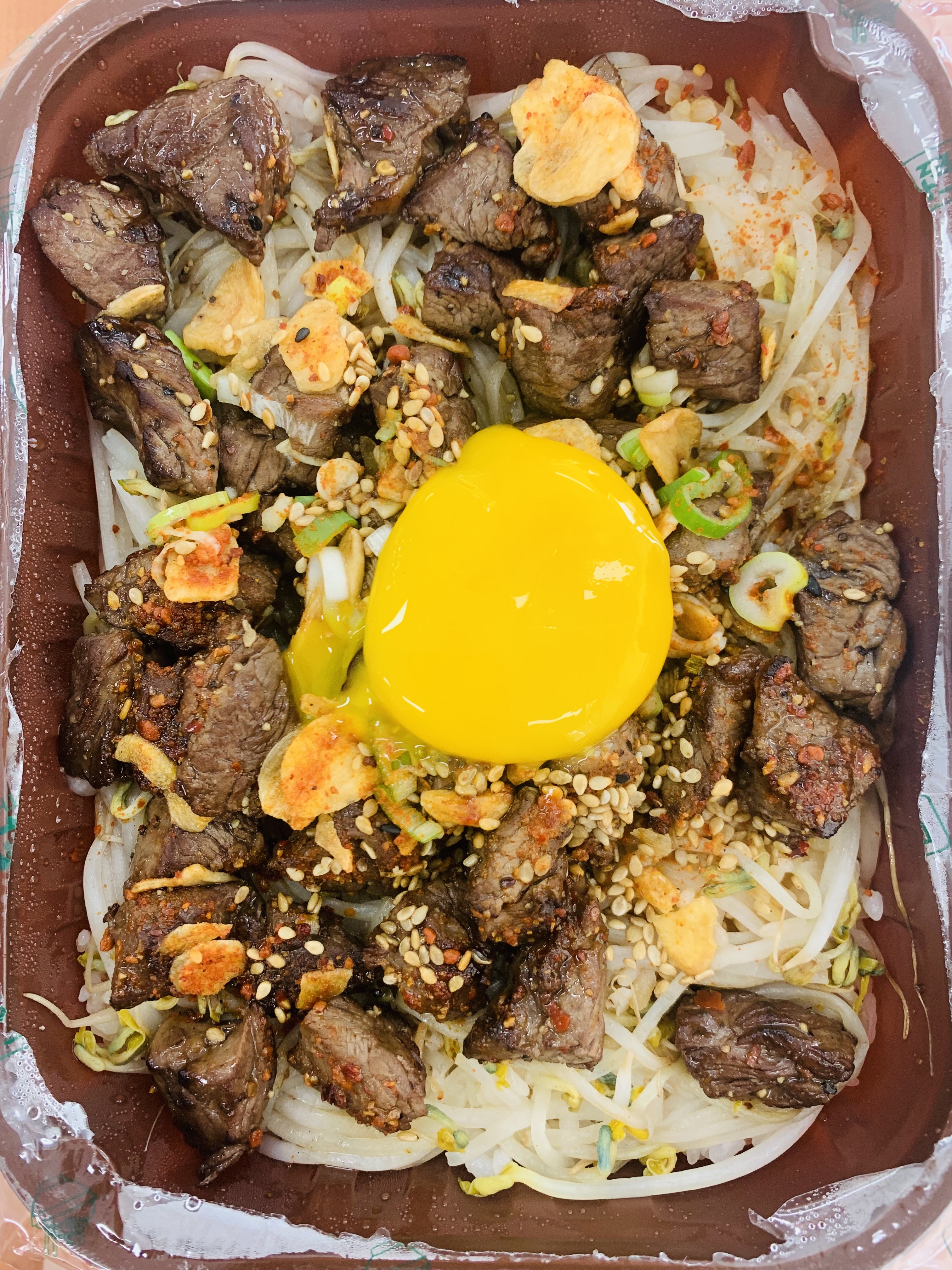 양파, 숙주, 갈릭 플레이크, 달걀노른자, 와사비