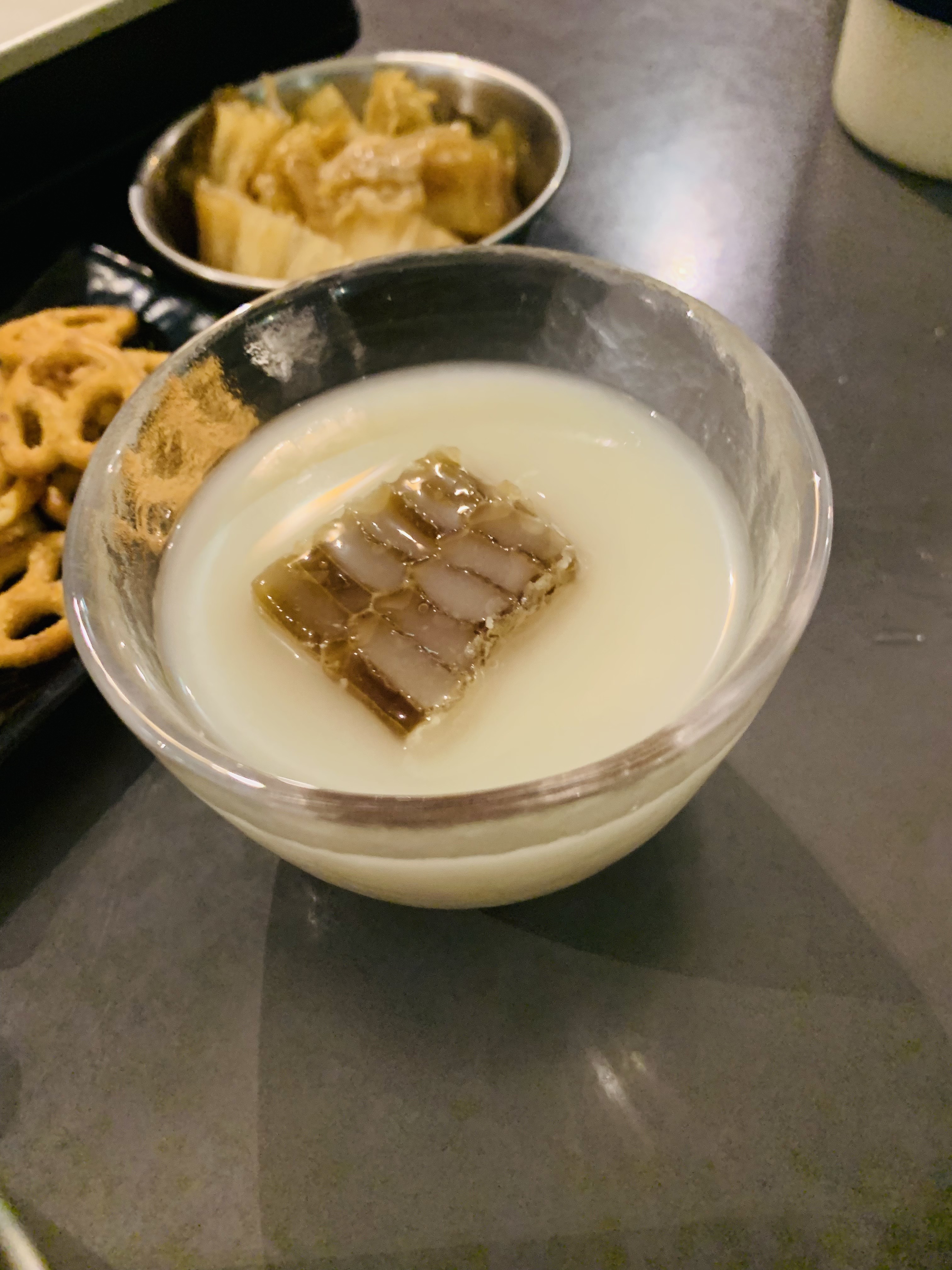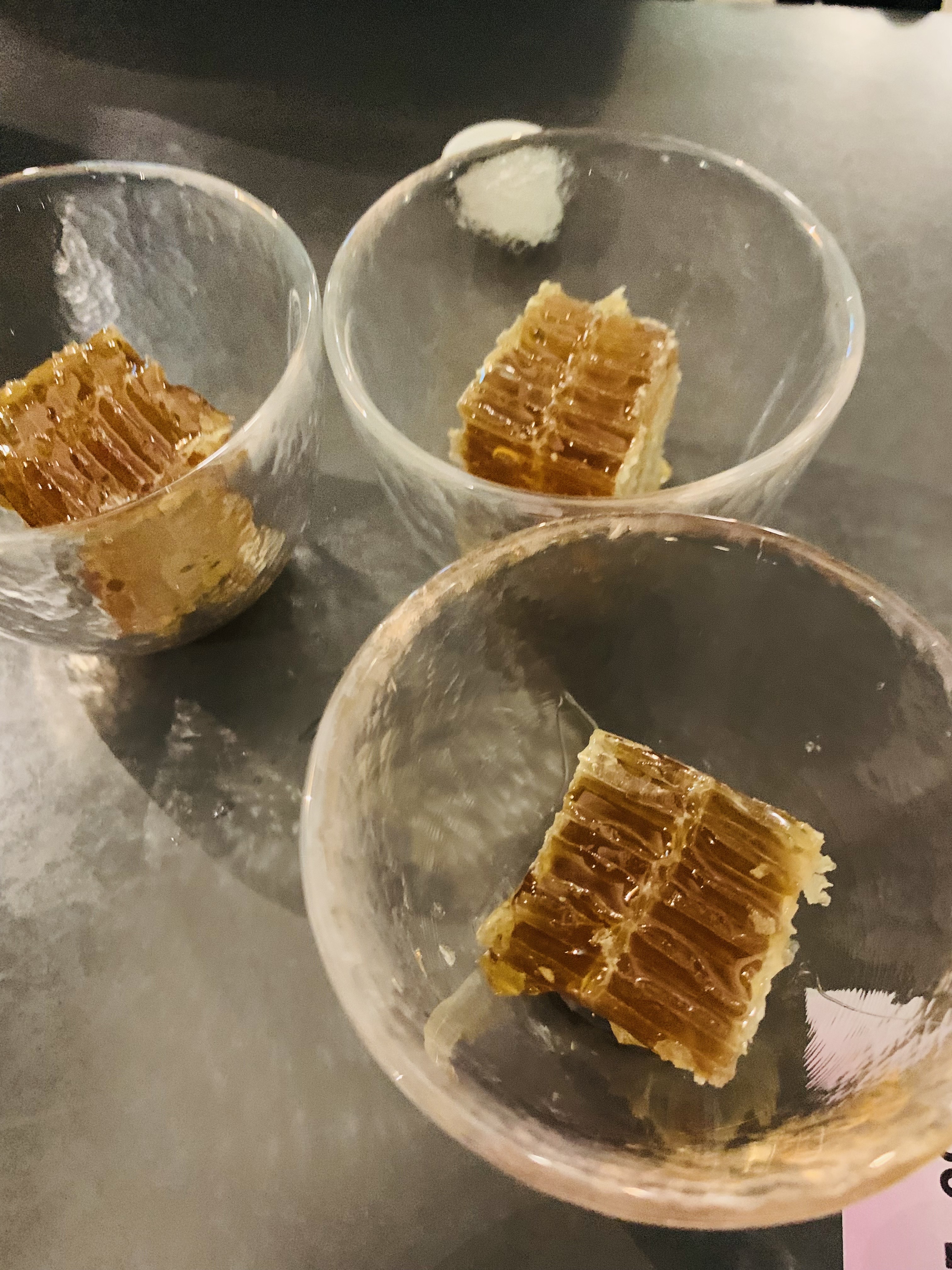 벌꿀집 조각을 막걸리잔에 넣고