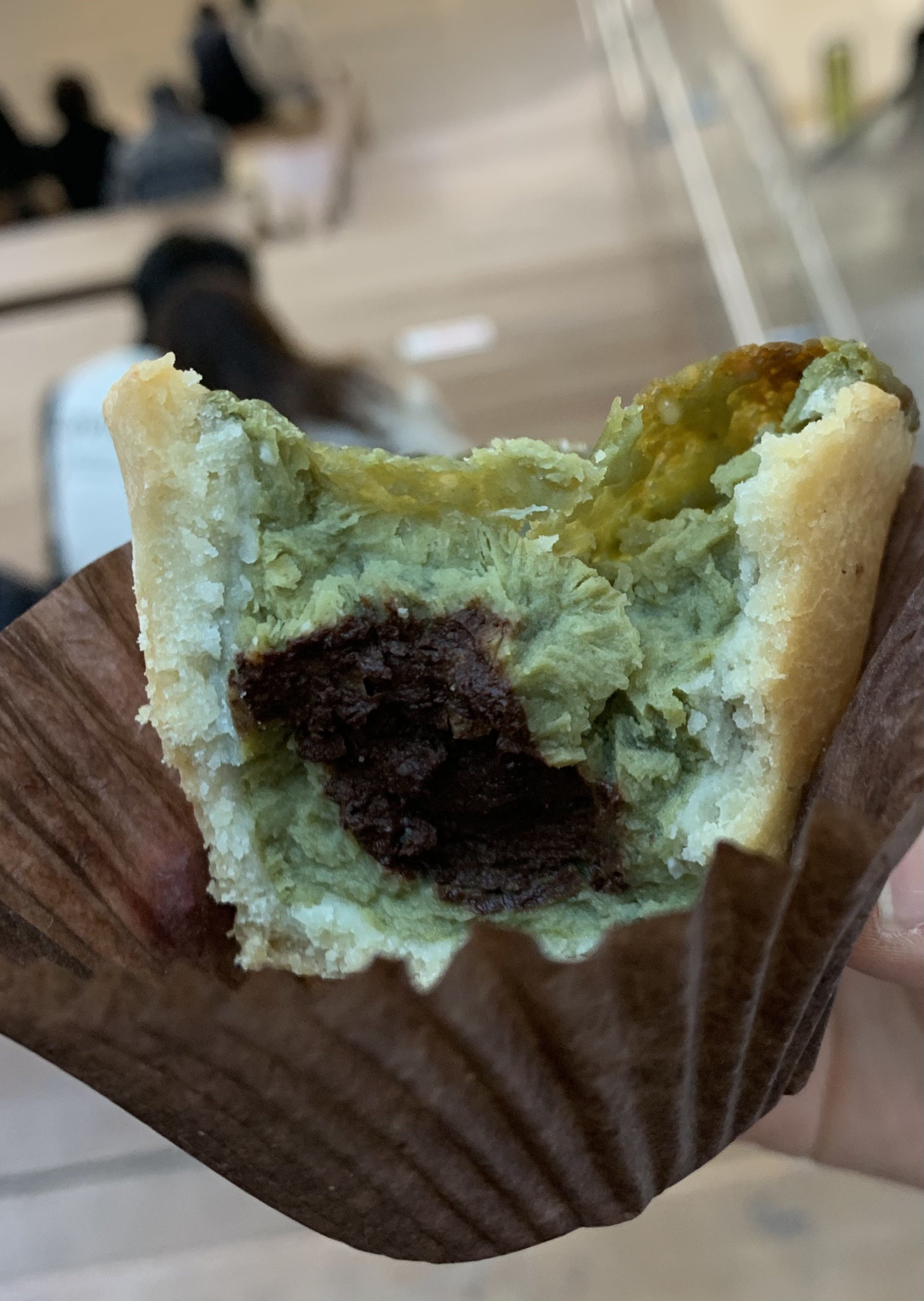 한 입 베어 물었더니 녹차와 초코가 조화롭게 들어있다는 것을 알 수 있는 단면