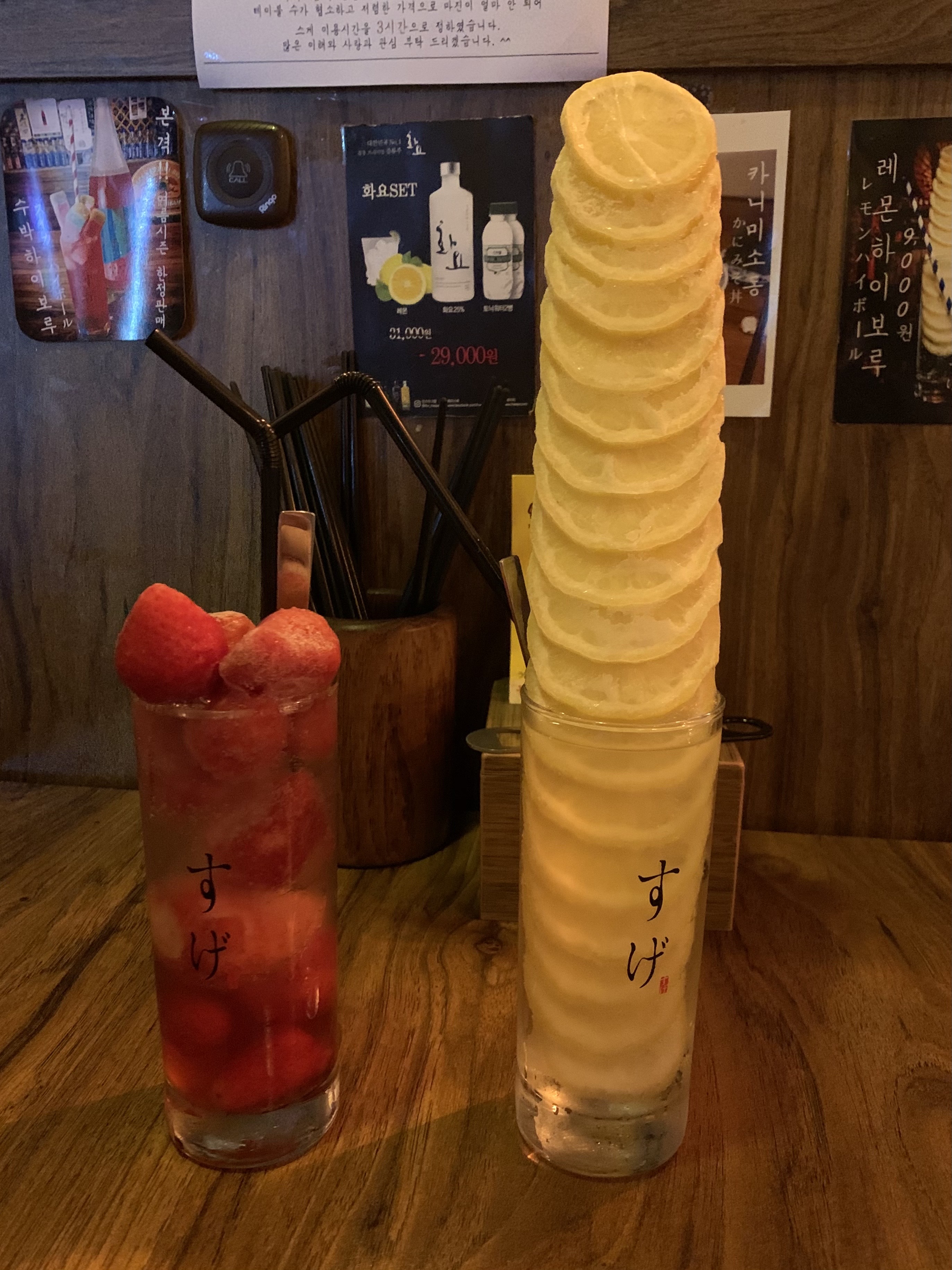 우리는 각자 레몬 하이볼, 딸기 하이볼을 시켰다