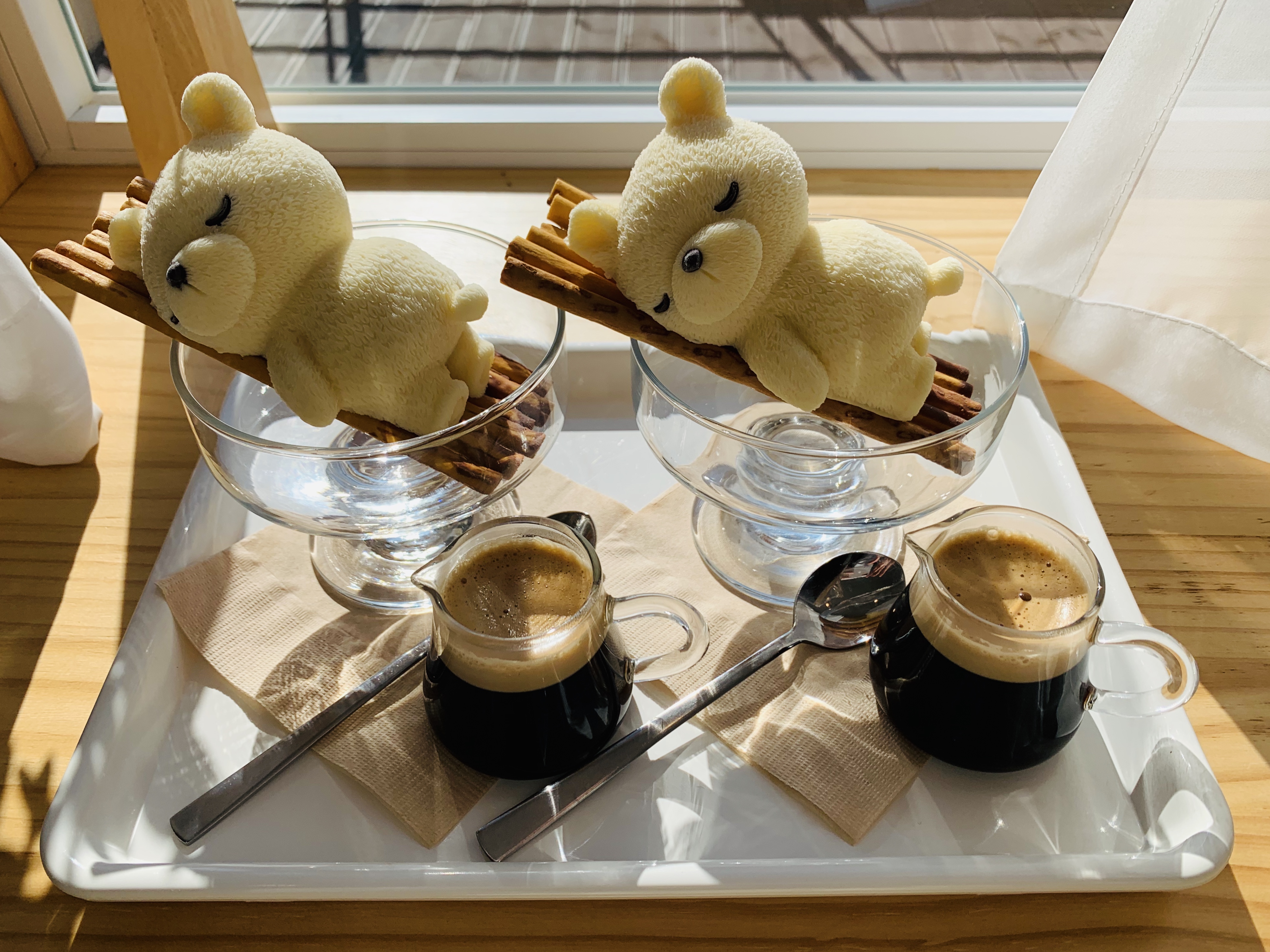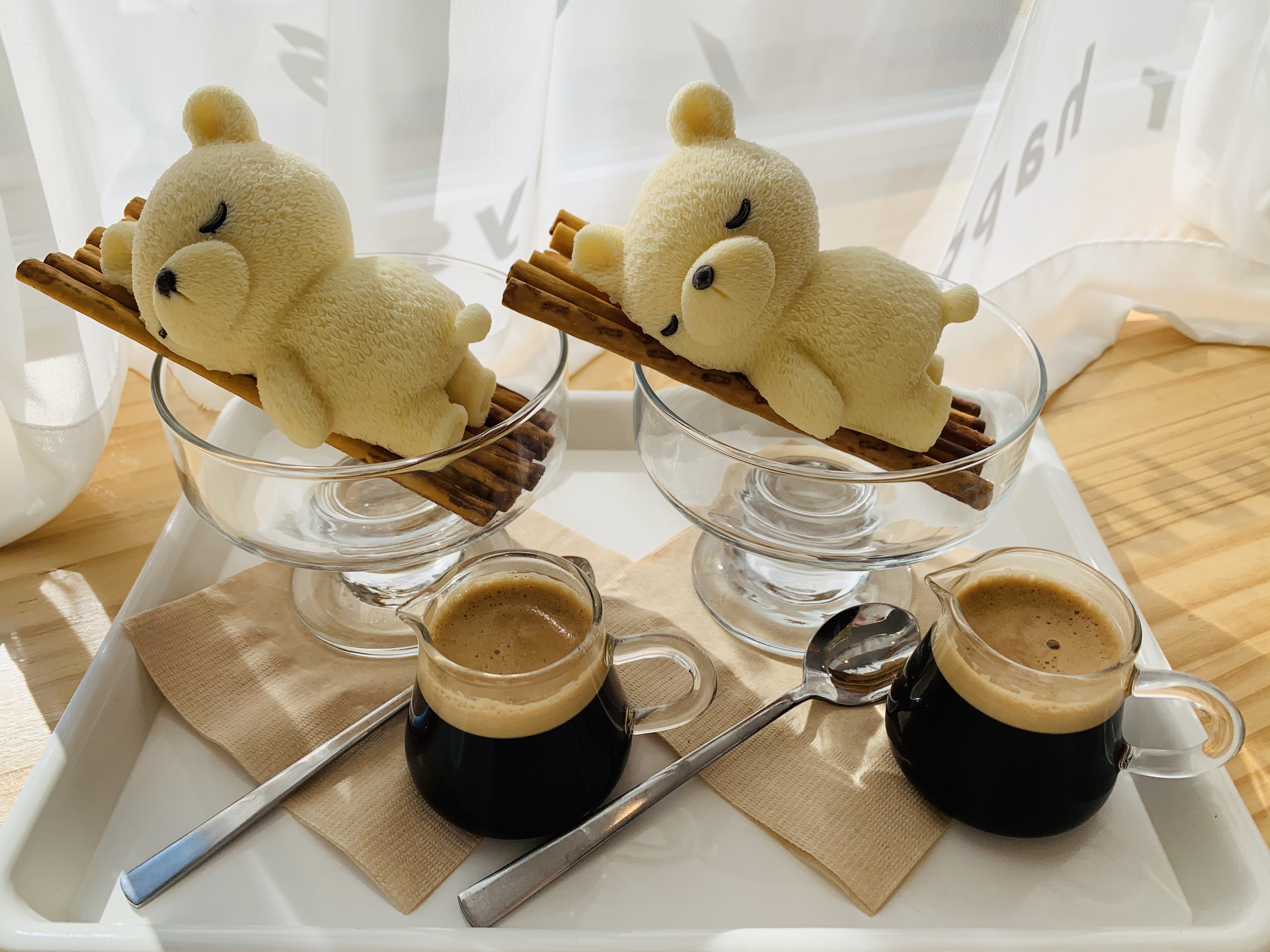 누드 빼빼로 6개 위에 곰돌이가 엎드려 있고 에스프레소와 작은 스푼이 함께 나온다