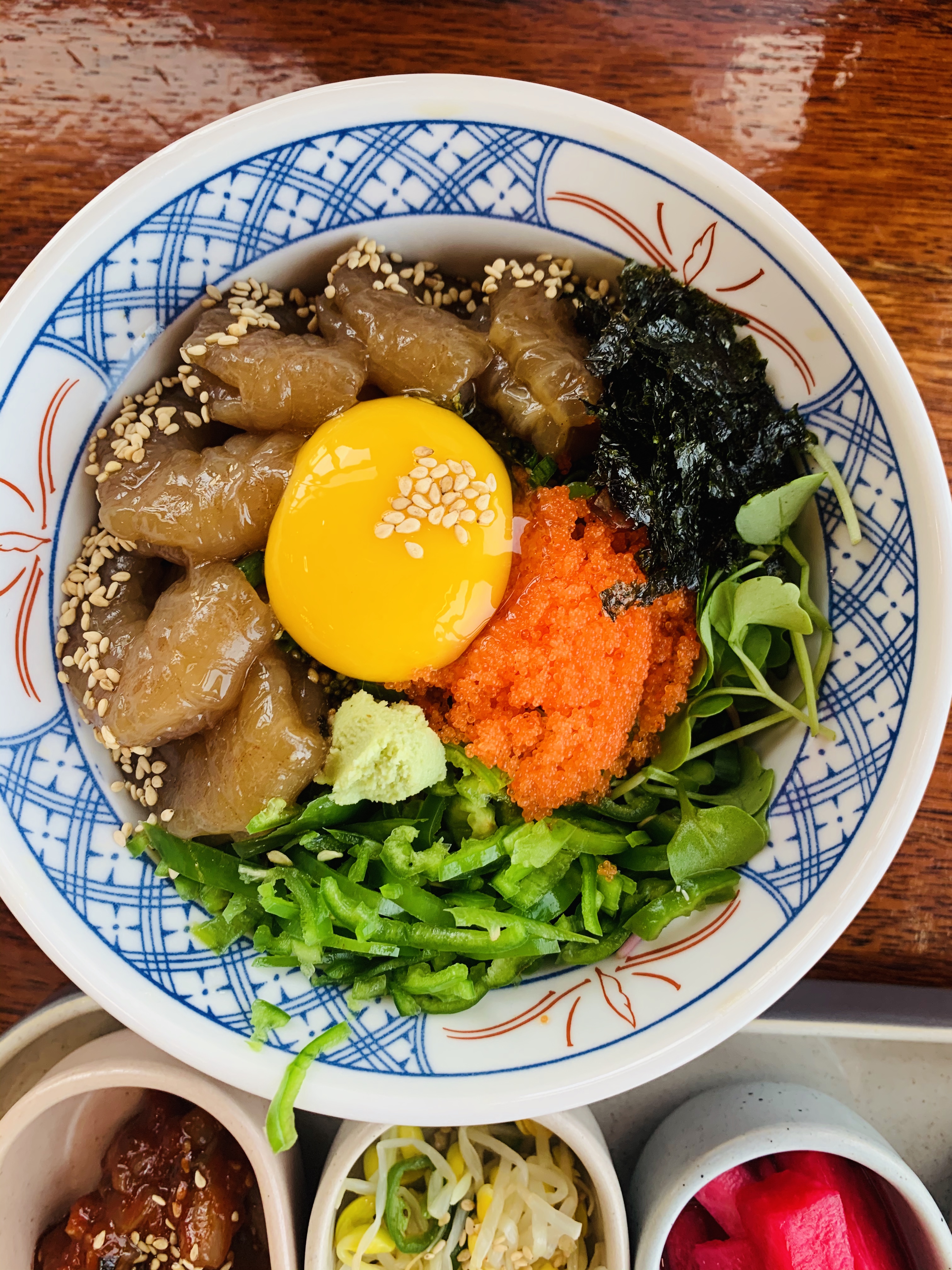 전복내장밥 위에 깐 새우장, 김, 날치알, 달걀노른자 등의 토핑으로 구성된다